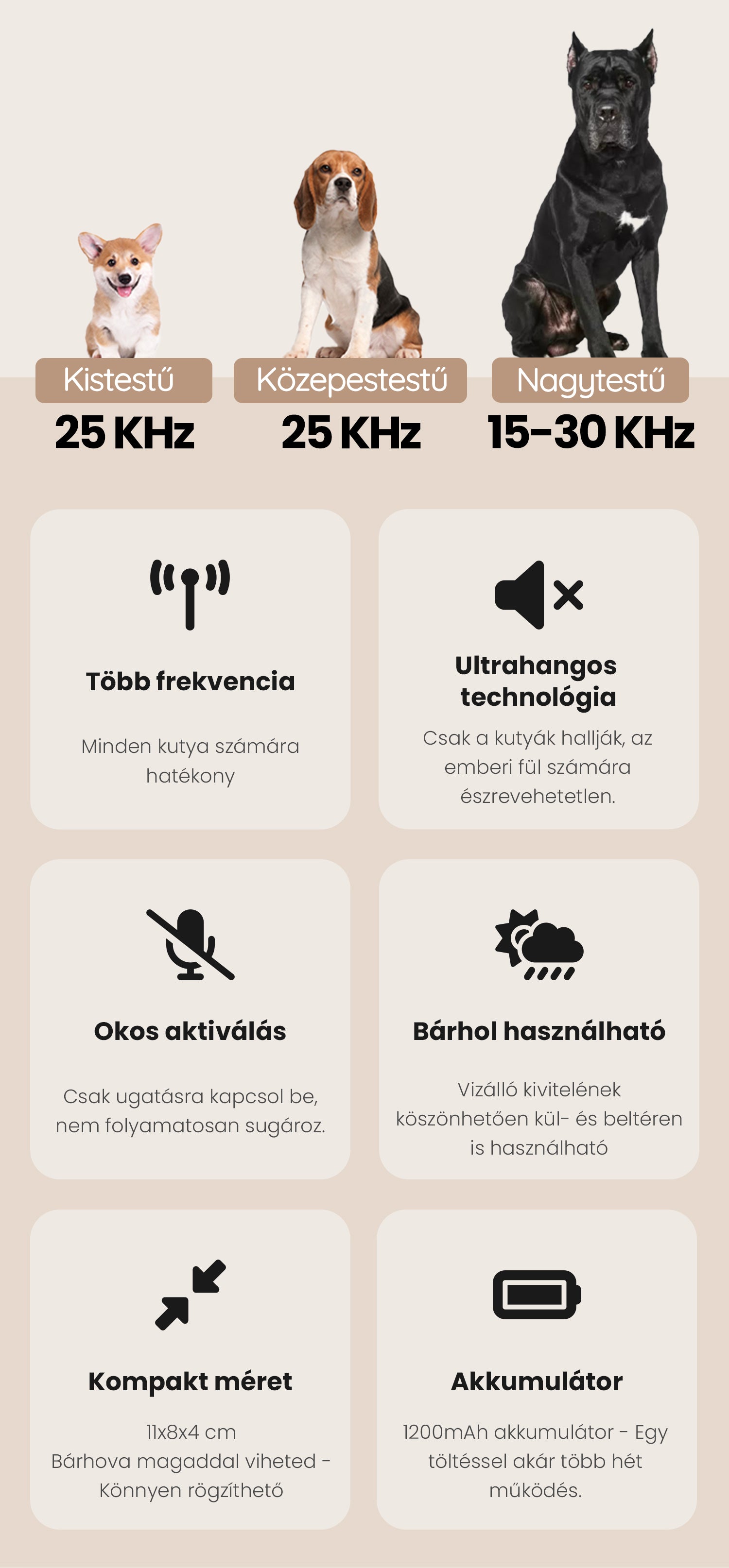 Igen, az ultrahangos hang teljesen biztonságos és fájdalommentes a kutyák számára. Célja csupán az ugatás megszakítása anélkül, hogy bármilyen fizikai kellemetlenséget okozna.